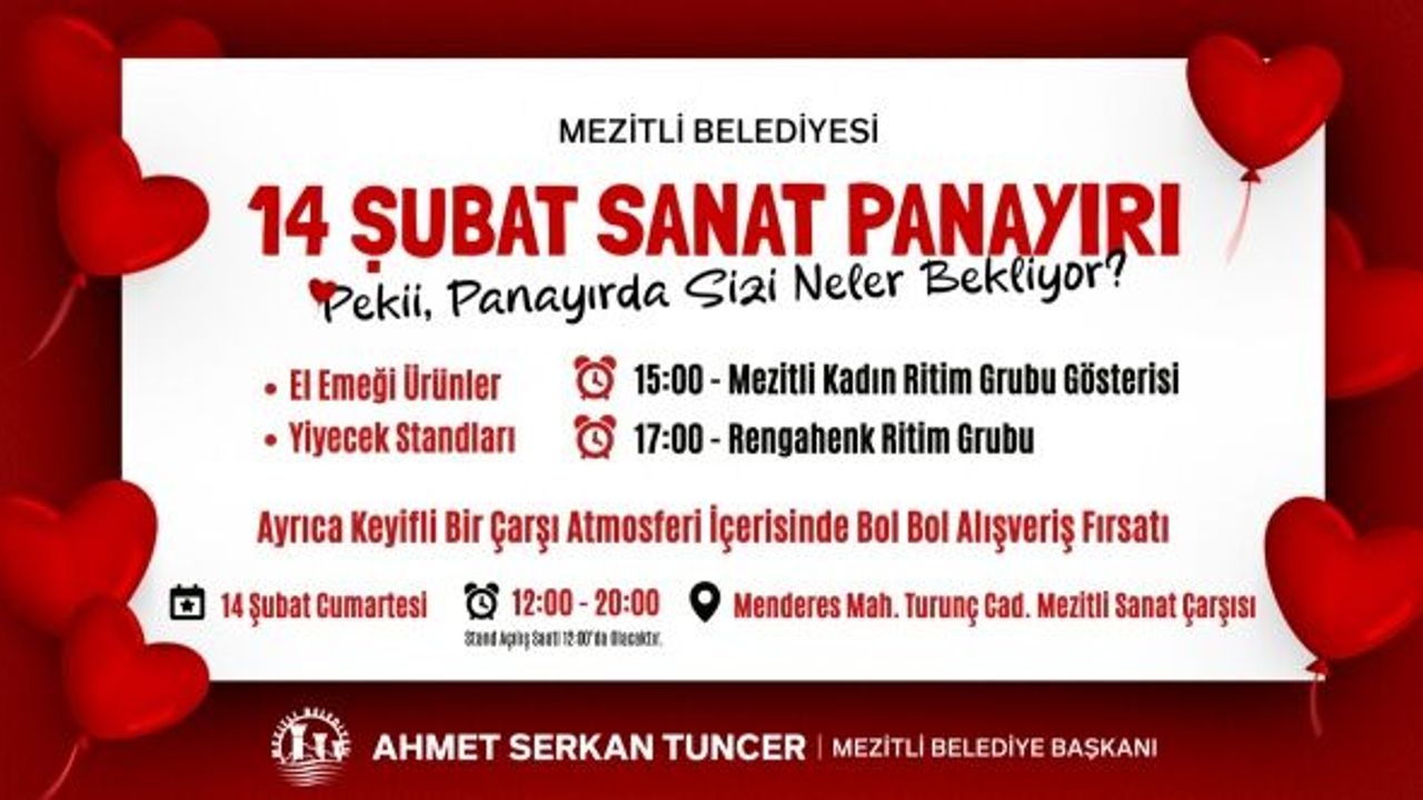 Mezitli Belediyesi, 14 Şubat’ta kente renk katacak özel bir etkinliğe daha imza atıyor. Sanatı ve üretimi desteklemek, el emeği üreticilerini vatandaşlarla buluşturmak amacıyla düzenlenen Sanat Panayırı, gün boyu sürecek dopdolu programıyla Mezitli Sanat Çarşısı’nda kapılarını açacak.