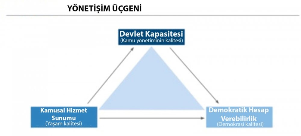 Rapora göre, aşağıda gösterilen “Yönetişim Üçgeni”: “Devlet Kapasitesi”, “Demokratik Hesap Verebilirlik” ve “Kamusal Hizmet Sunumu”ndan oluşuyor. Bu kavramlar sırasıyla; “kamu yönetiminin kalitesini”, “demokrasi kalitesini” ve “yaşam kalitesini” anlatıyor.