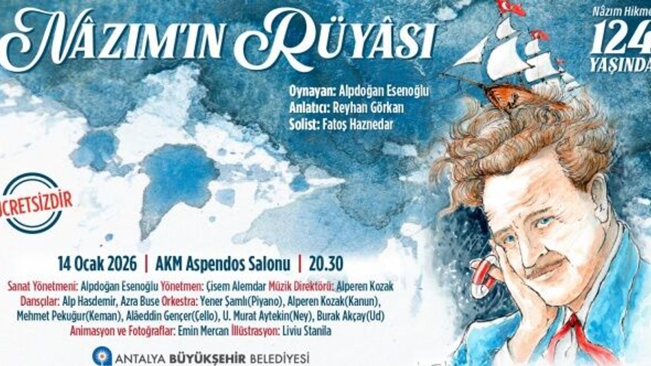 Türk şiirinin evrensel sesi Nâzım Hikmet, doğumunun 124. yılında Antalya Büyükşehir Belediyesi Kültür, Sanat ve Sosyal İşler Dairesi Başkanlığı’nın özel bir sahne yapımıyla anılıyor. “Nâzım’ın Rüyâsı”, şairin dizelerinden, düşlerinden ve hayata bakışından ilham alan özgün anlatımıyla 14 Ocak Çarşamba akşamı Atatürk Kültür Merkezi Aspendos Salonu’nda seyirciyle buluşacak.