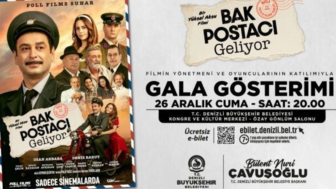 ‘Ege Şehri Denizli’ ve ‘Sanat Şehri Denizli’ vizyonuyla çalışmalarına devam eden Denizli Büyükşehir Belediyesi, düzenlediği etkinliklerle dikkat çekiyor. Şehrin sosyal ve kültürel yaşamına zenginlik katarak konserden tiyatroya, dans festivallerinden sinema günlerine kadar sanatın farklı dallarıyla sanatseverleri buluşturmaya devam eden Denizli Büyükşehir Belediyesi bu kez “Bak Postacı Geliyor” filminin galasına ev sahipliği yapacak.