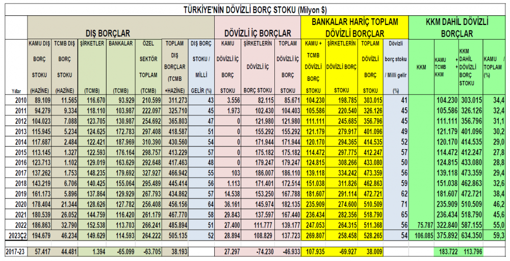 Aşağıda yer verdiğimiz ve R. Hakan Özyıldız tarafından hazırlanan tablo ise bu aşk hikâyesinin bir başka biçimine dikkat çekiyor. Buna göre, toplam döviz cinsinden borçların miktarı son yıllarda ciddi olarak artış göstererek, bu yılın ikinci çeyreği itibarıyla, 634 milyar doları aşmış bulunuyor.