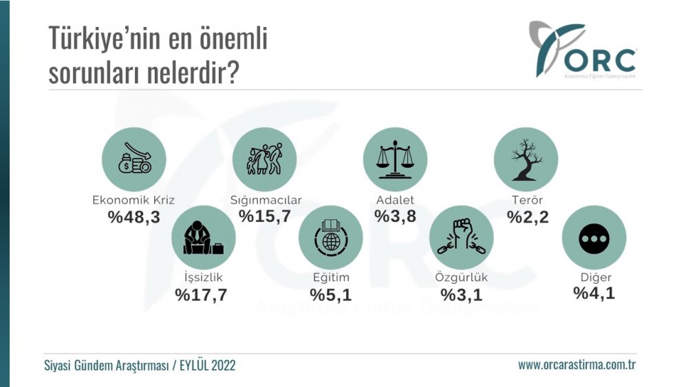 Ankete katılanlar, Türkiye'nin en önemli sorununu ise ekonomik kriz olarak gördüklerini ortaya koydula. Ekonomik kriz diyenlerin yanıtı yüzde 48,3 olurken; işsizlik %17,7 ve sığınmacılar %15,7 ile diğer önemli oranlar olarak tespit edildi.