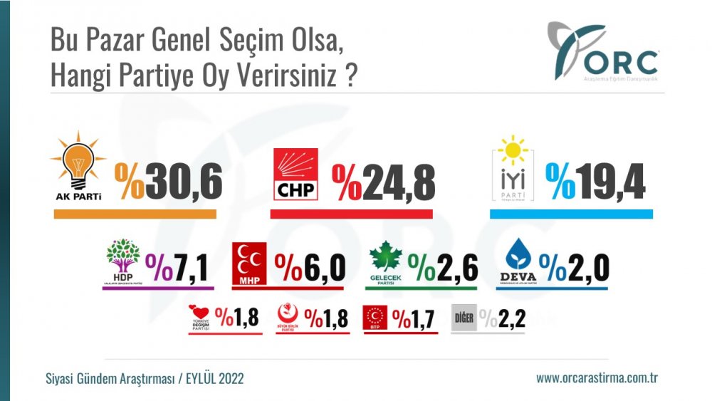 ORC'nin Eylül ayı seçim anketi yayınlandı. 17-21 Eylül tarihleri arasında 33 ilde 6 bin 190 kişinin katıldığı araştırmada Cumhur İttifakı, Millet İttifakı'nın bir hayli gerisinde kalıyor.